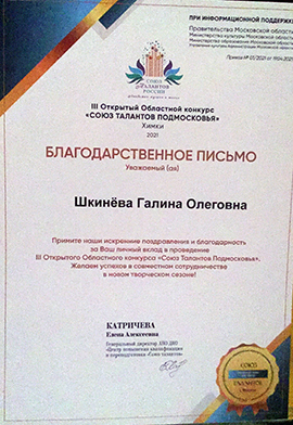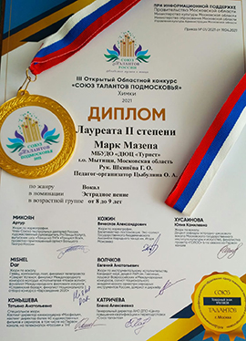 3 октября 2021 г. во Дворце Культуры «РОДИНА» г. Химки прошел III открытый областной конкурс «СОЮЗ ТАЛАНТОВ ПОДМОСКОВЬЯ» в рамках XXVII творческого сезона Международной Академии музыки и танца «Союз талантов России». Организатором являлась Международная академия музыки и танца «СОЮЗ ТАЛАНТОВ РОССИИ» при содействии: Государственной Думы РФ, Правительства Московской области, Министерства культуры Московской области, Министерства образования Московской области, Управления культуры Администрации Московской области. В конкурсе принимали участие солисты и ансамбли, занимающиеся на базе ДШИ, ДМШ, досуговых центров, ДК, в средне-специальных музыкальных учебных заведениях, творческие коллективы или отдельные исполнители различных жанров; хореографические, вокальные студии, инструментальные ансамбли и отдельные исполнители как любительские, так и профессиональные. Возраст участников от 5 до 35 лет и старше. От МБУДО «ДЮЦ «Турист» на конкурсе выступал Марк Мазепа. Талантливый воспитанник объединения педагога Галины Олеговны Шкинёвой занял 2 место в своей возрастной категории в жанре «Вокал».