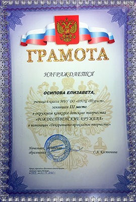 Работу нашей воспитанницы Елизаветы Осиповой заметили и наградили грамотой за 3 место в окружном конкурсе творчества «Рождественские кружева»!!!