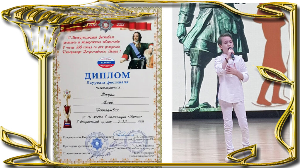 6 мая 2022 года состоялся полуфинал Международного фестиваля патриотической песни и музыкального произведения детского и молодежного творчества, посвящённый 350-летию со дня рождения Пётра I. Организаторы: Российский союз неправительственных организаций «ОТЕЧЕСТВО», Общероссийская общественная организация ветеранов «Российский Союз ветеранов». Цель фестиваля – поиск и открытие новых ярких и талантливых детей и молодежи, создание условий для реализации их творческих способностей. Жюри возглавлял народный артист России Бедрос Киркоров, которому в июне исполнится 90 лет. На участие в фестивале «Молодые таланты Отечества» было подано 1360 заявок из 47 регионов России, а также от наших соотечественников из Беларуси, Узбекистана, Сирии и Великобритании. В число полуфиналистов попал и наш юный певец из объединения «Театрализованные праздники» (руководитель Шкинева Галина Олеговна) Марк Мазепа и занял III место. 27 мая 2022 года в Краснознамённом зале Московского Дома ветеранов Войн прошло награждение!