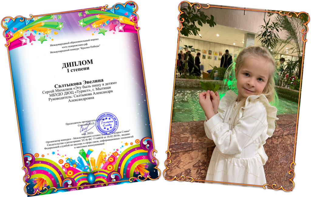 Подведены итоги Международного конкурса «Крылья Победы» — организатор – Международное сетевое издание «Галерея Славы». Салтыкова Эвелина, обучающаяся в МБУДО ДЮЦ «Турист» в объединении «Логоритмика» получила Диплом I степени в номинации «Художественное слово» со стихотворением Сергея Михалкова — «Эту быль пишу я детям» — руководитель — педагог дополнительного образования Салтыкова Александра Александровна. Желаем дальнейших творческих успехов и вдохновения, развивайте свои замечательные таланты и покоряйте новые «вершины».
